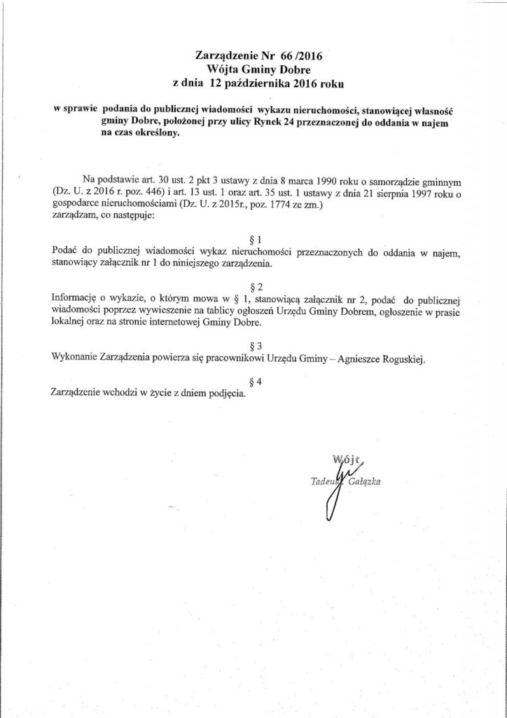 Przetarg na najem lokalu użytkowego na czas określony, usytuowanego w Dobrem przy ulicy Rynek 24