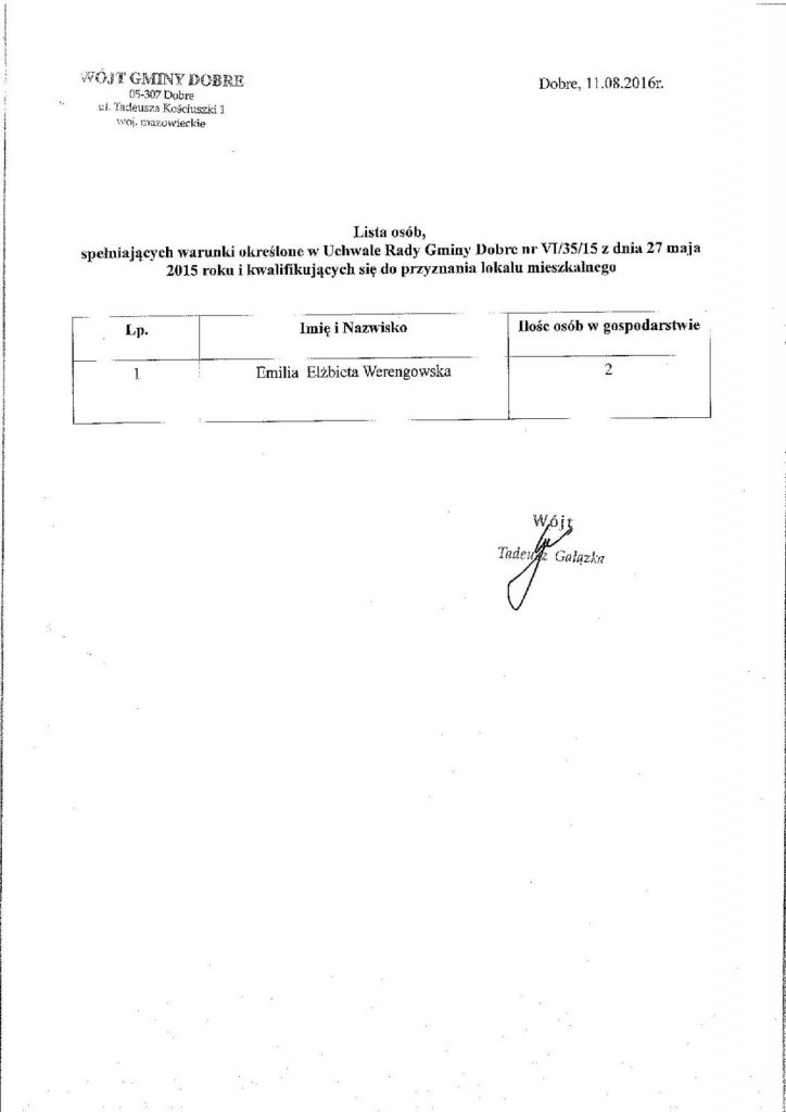 Odpowiedzialnym za wykonanie zarządzenia czyni się Agnieszkę Roguską – pracownika Urzędu Gminy.