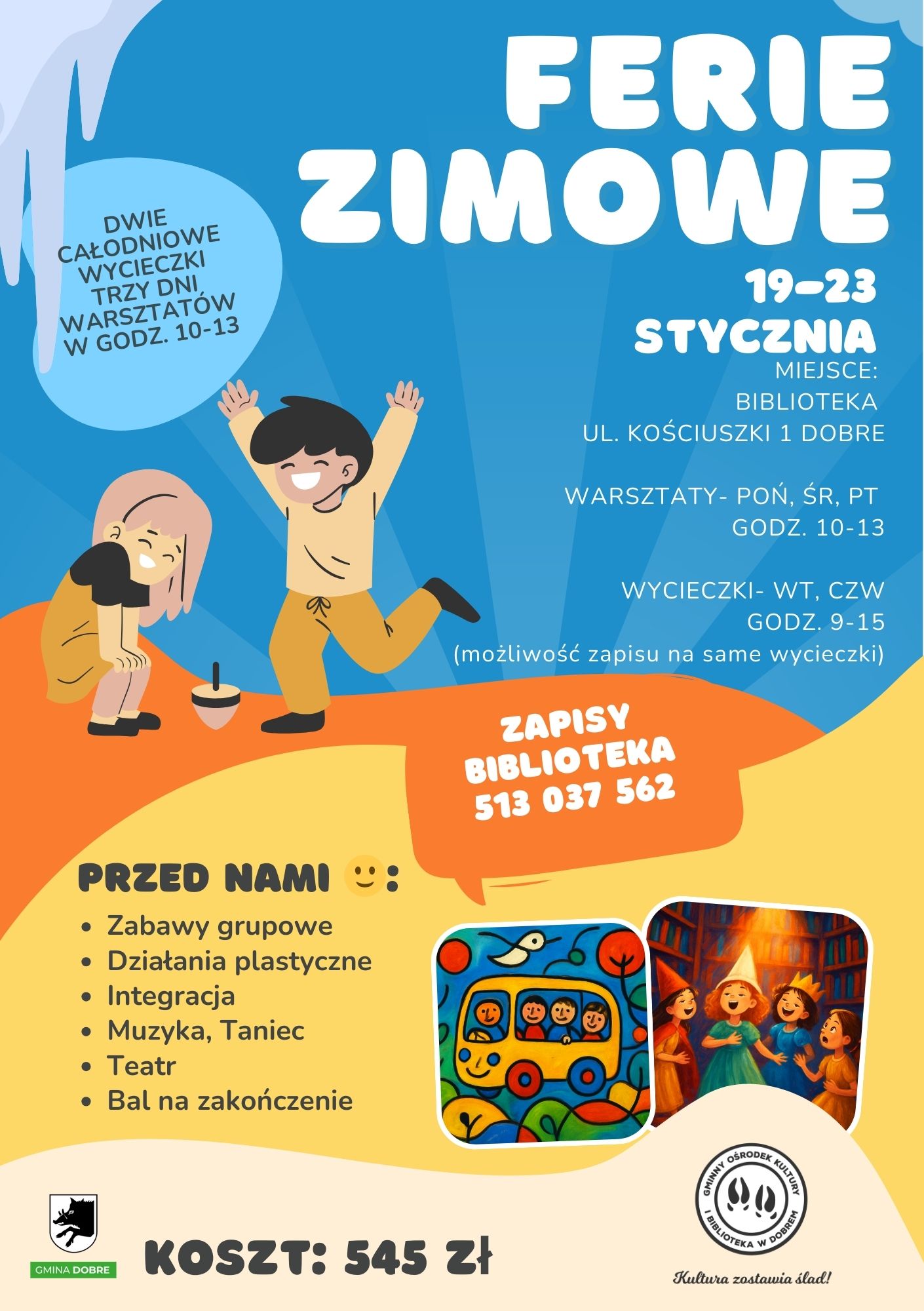 W dniach 19–23 stycznia w Bibliotece w Dobrem, mieszczącej się przy ul. Kościuszki 1, odbędą się zajęcia feryjne dla dzieci w ramach oferty przygotowanej przez Gminny Ośrodek Kultury i Bibliotekę w Dobrem.