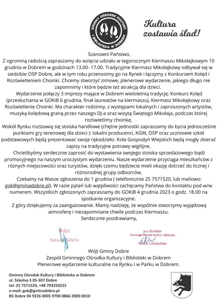 Zapraszamy 10 grudnia na Kiermasz Mikołajkowy , Rozświetlenie choinki na Rynku w Dobrem.
