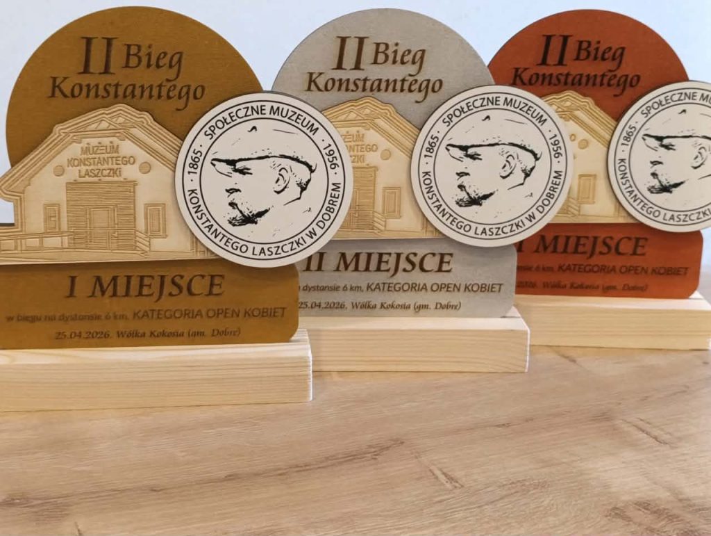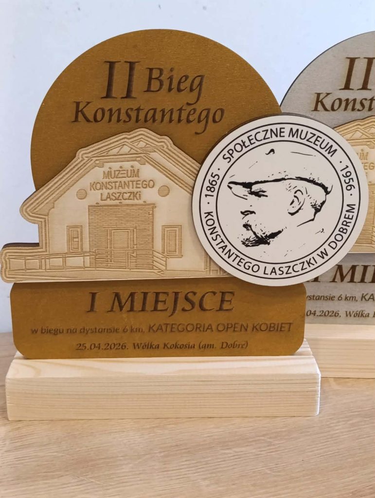 Nagrody z drewna na II Bieg Konstantego w różnych kolorach: brąz, szary, pomarańczowy. Widać nazwę muzeum i datę. Tło jasne, stonowane.