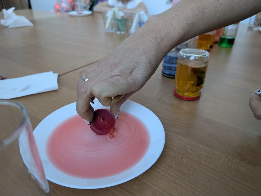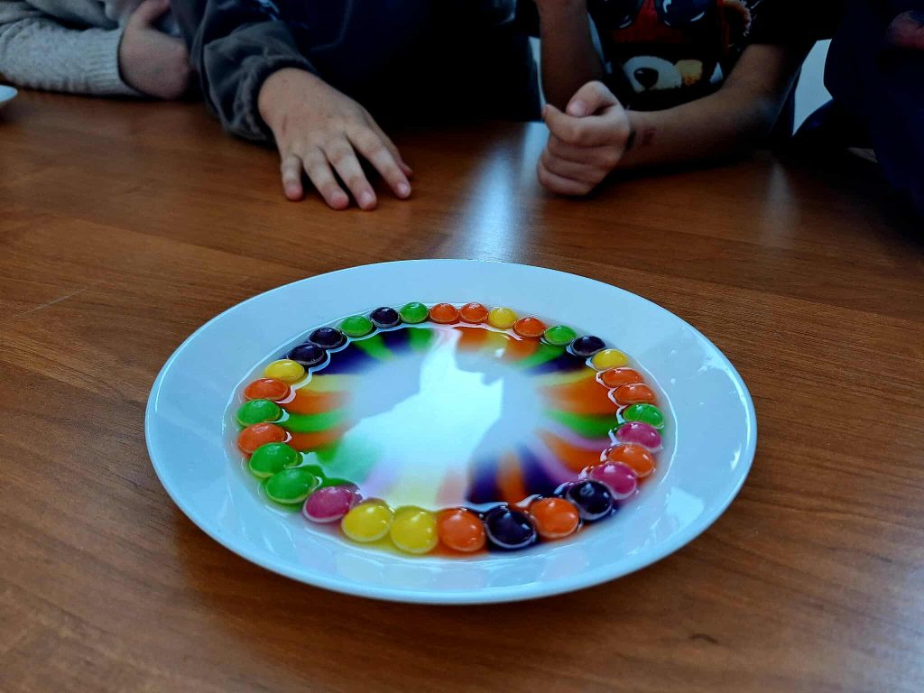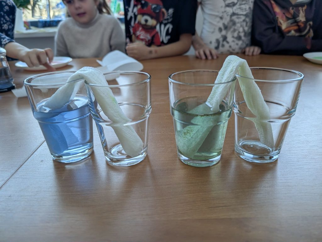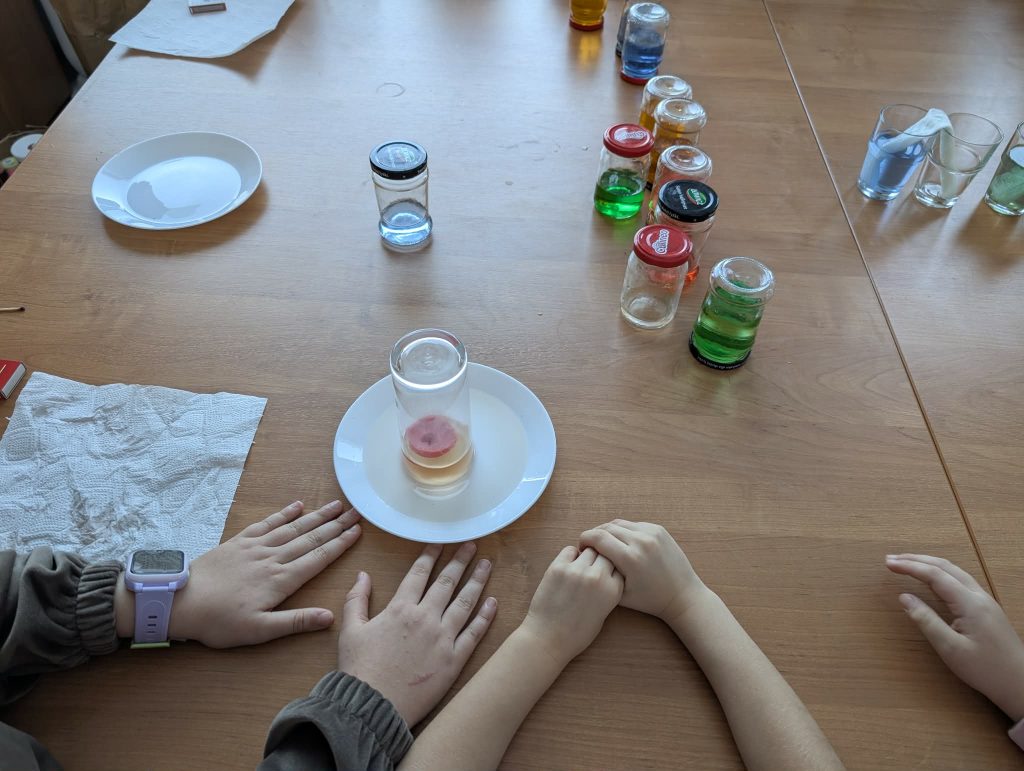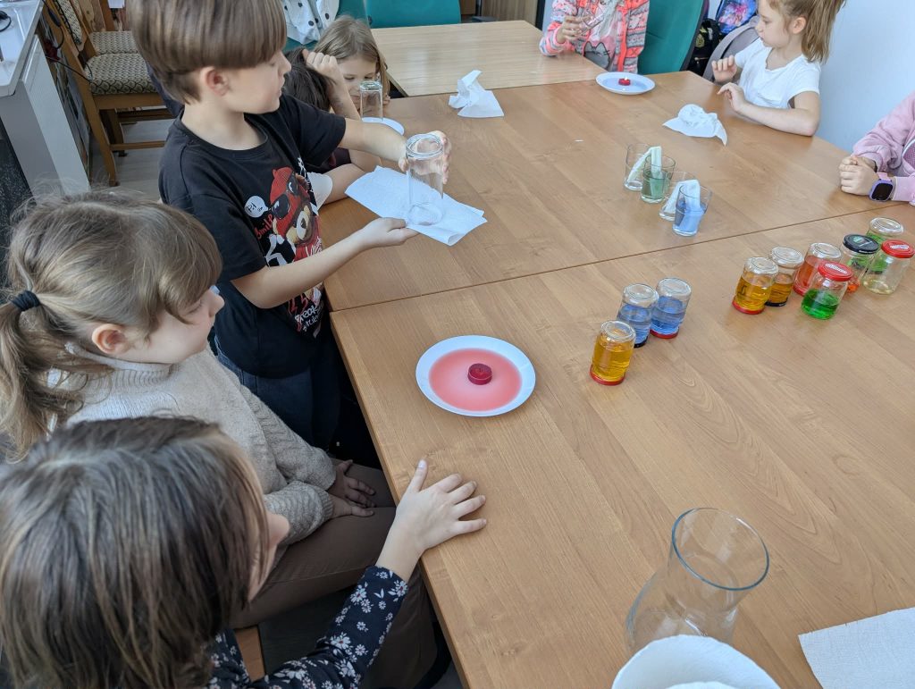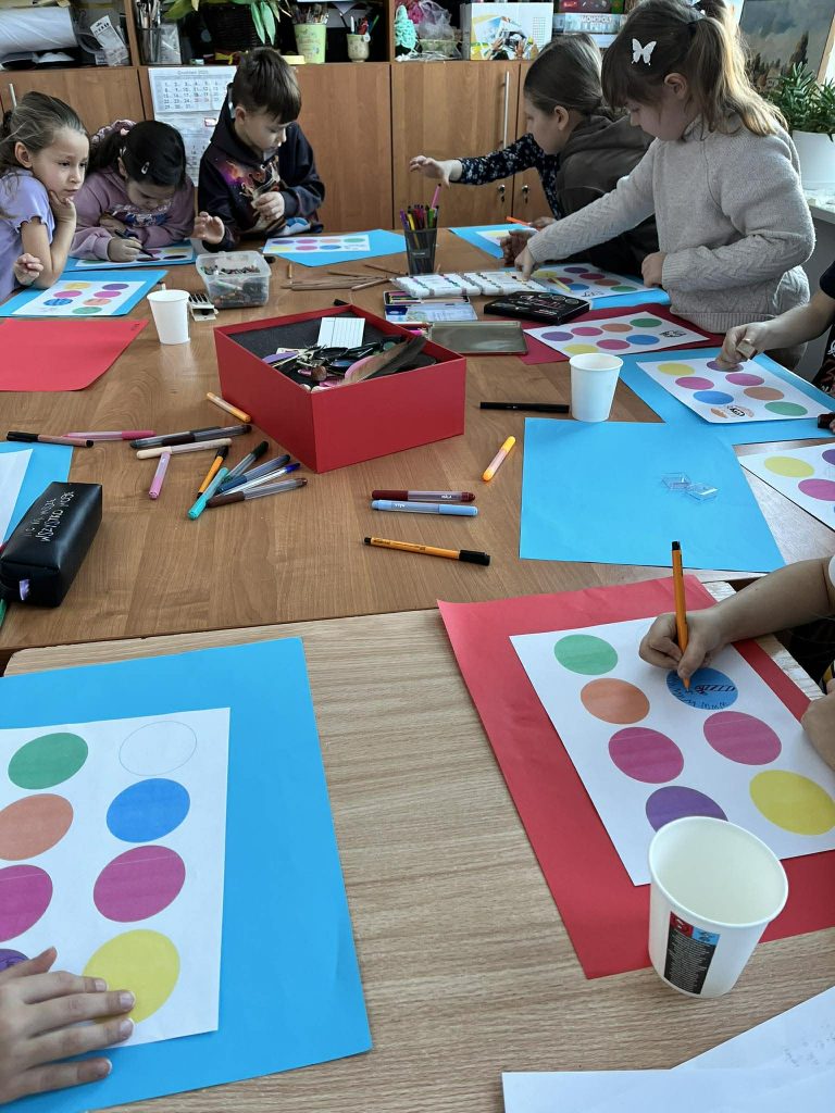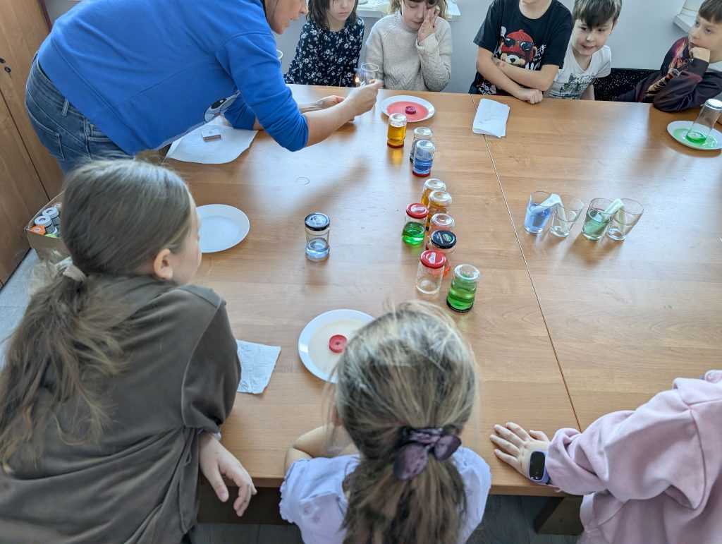 Podczas zajęć dzieci brały udział w warsztatach plastycznych, w trakcie których eksperymentowały z kolorami oraz poznawały podstawowe zasady łączenia barw. Elementem programu były również proste doświadczenia, pozwalające obserwować reakcje kolorów i rozwijać ciekawość poznawczą. Zajęcia sprzyjały koncentracji, kreatywności oraz współpracy w grupie.