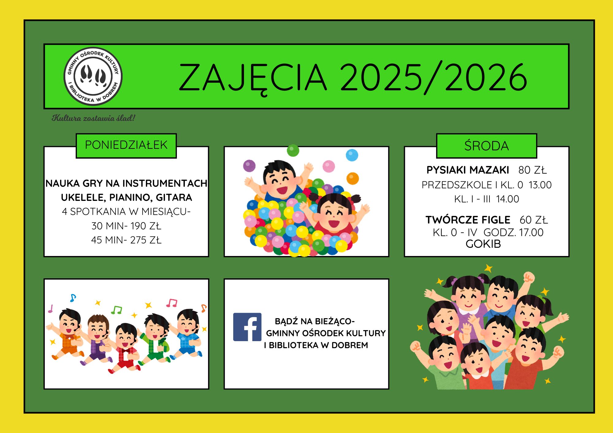 Gminny Ośrodek Kultury i Biblioteka w Dobrem zaprasza wszystkich zainteresowanych do skorzystania z oferty zajęć dodatkowych i aktywnego uczestnictwa w życiu kulturalnym gminy.