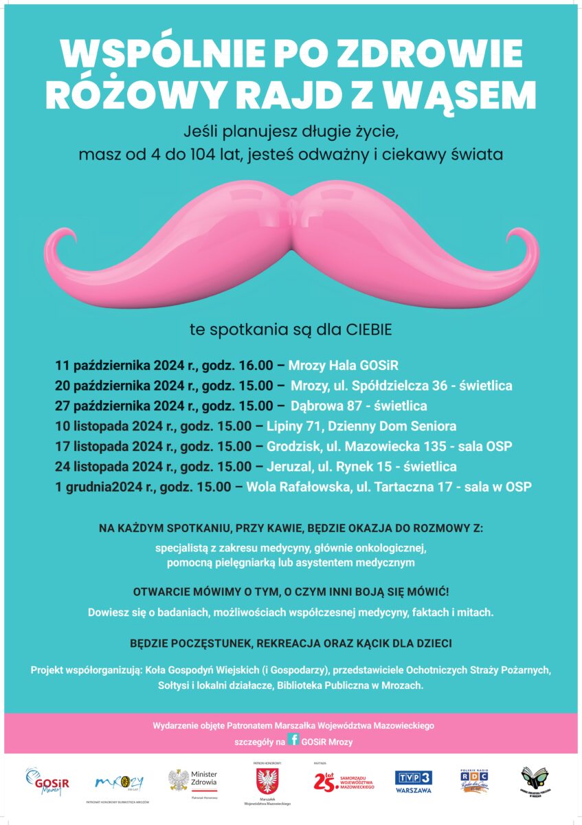 Gminny Ośrodek Sportu i Rekreacji w Mrozach serdecznie zaprasza na spotkania – dalszą część cyklu – Wspólnie po zdrowie: Różowy Rajd z Wąsem.