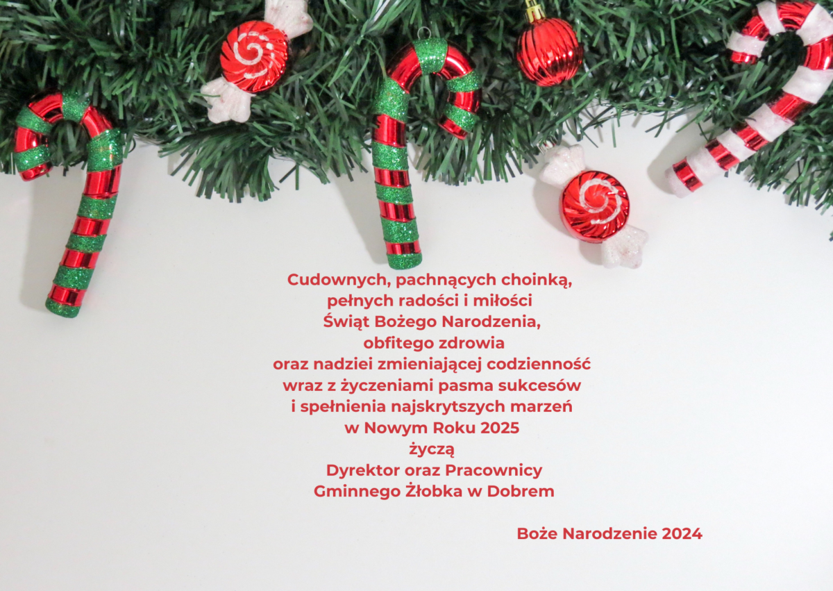 Życzenia świąteczne od Gminnego Żłobka Strona główna / Aktualności / 🔊 Posłuchaj treści aktualności Na zbliżające się Boże Narodzenie i Nowy Rok 2025 przesyłamy najserdeczniejsze życzenia.